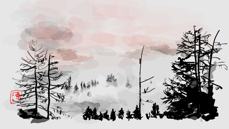 This is a digital painting. The fog behind my house.