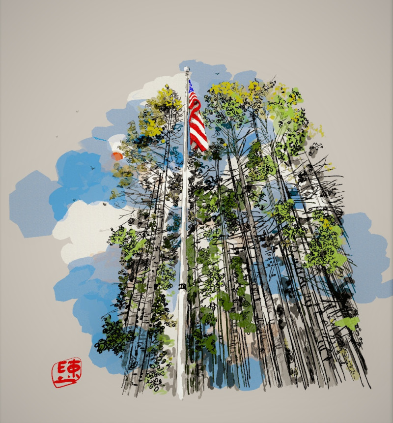 This flag hung in my friend's yard until they moved. It was done in virtual reality by hand using QUILL app. It interested, contact me.
