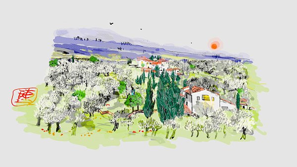 Done digitally in VR. I love these Trulli stone homes as they are only found in one area. Southern Italy, Apuglia province, where my grandfather was born and so I have a few reasons they move me.