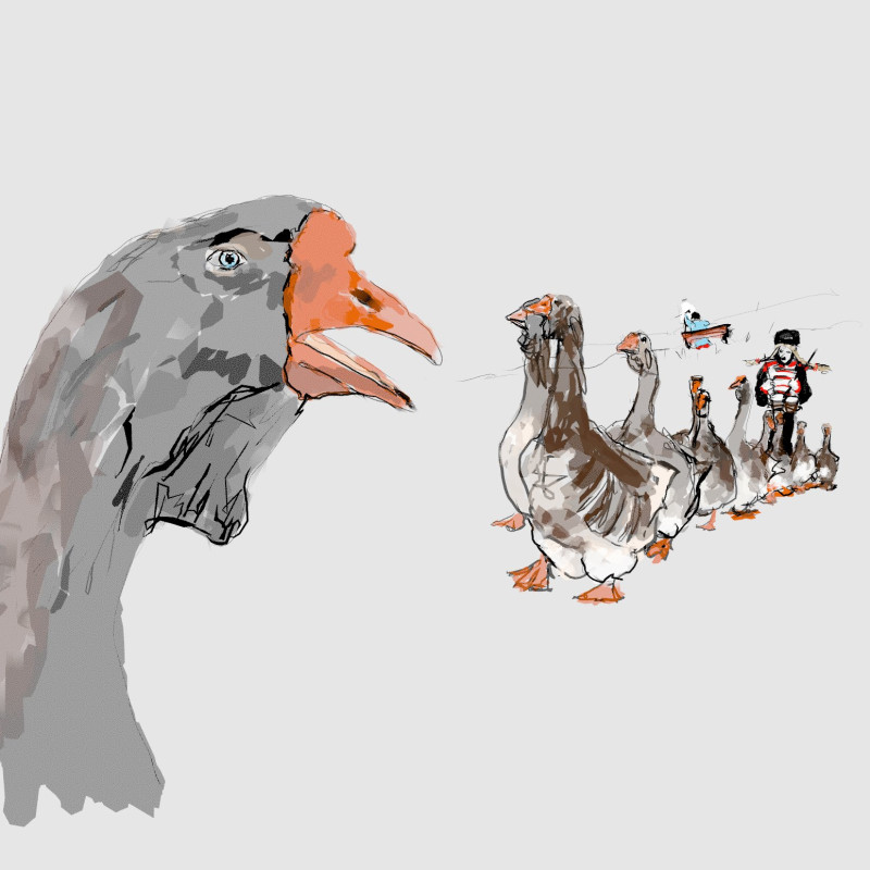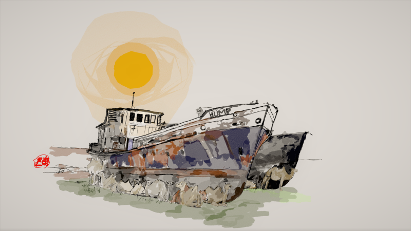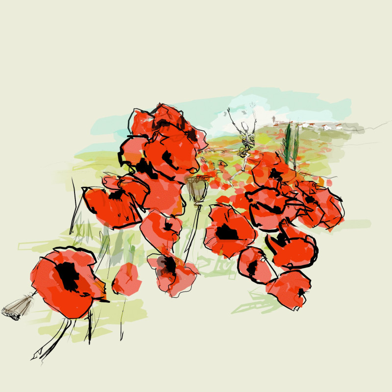 A landscape with fields of poppies commin in Tuscany area. The joyful skeleton is a surprise. Done in Virtual reality using the QUILL app. No AI used.