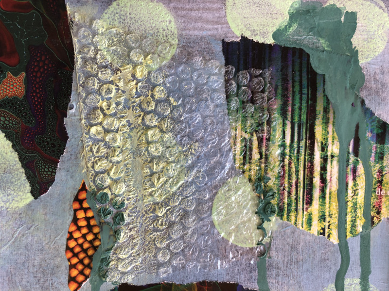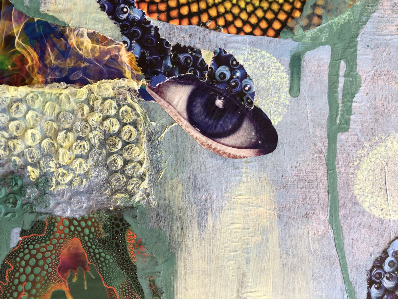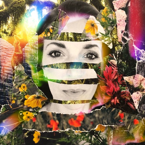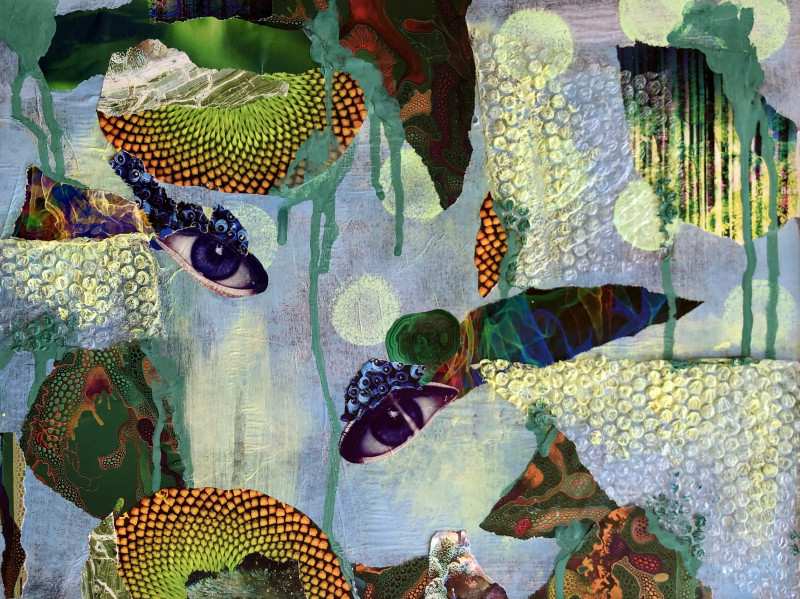Her primary form of expression is analog collage with mixed techniques, which she sees as a manifestation of her quest for expanding consciousness through art. Her artistic process is manual, "old school," an intuitive and sensory cut-and-paste inspired by the nature of the island where she lives.