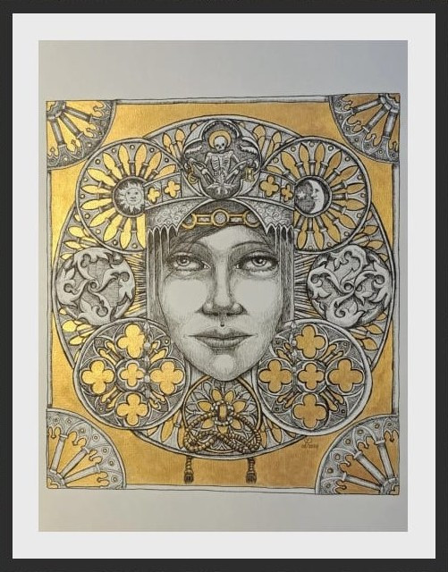The interplay of ink and gold leaf generates a duality: the precision of line and stippling anchors the work in realism, while the radiant gold field transforms it into a timeless icon. Rich with medieval and mythological echoes, the piece blurs the boundaries between portrait, symbol, and sacred image.