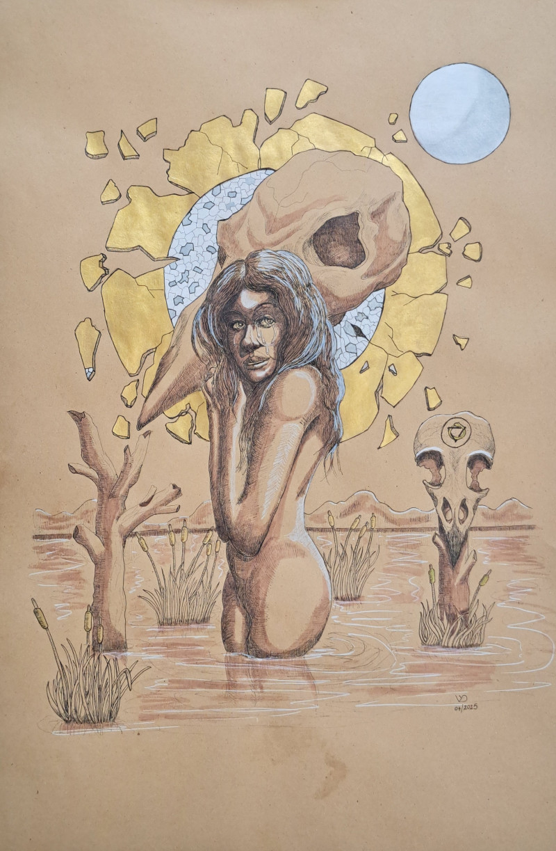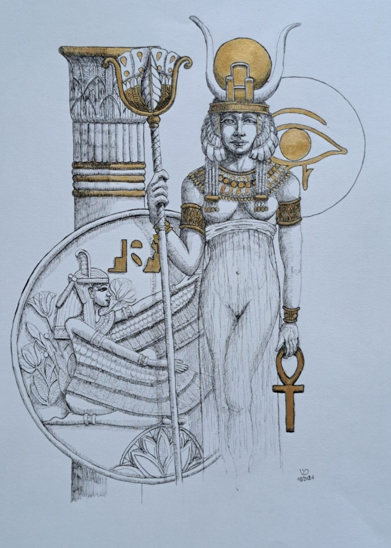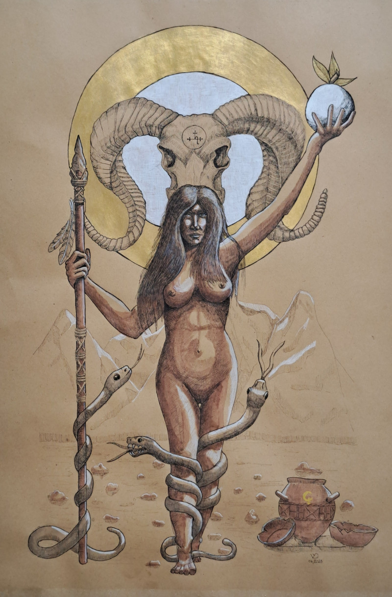 The delicate ink linework renders the figure with both sensuality and monumentality, while accents of gold leaf elevate the composition into the realm of the sacred. The goddess emerges not as a distant myth, but as an enduring force, timeless in her authority and mystery.