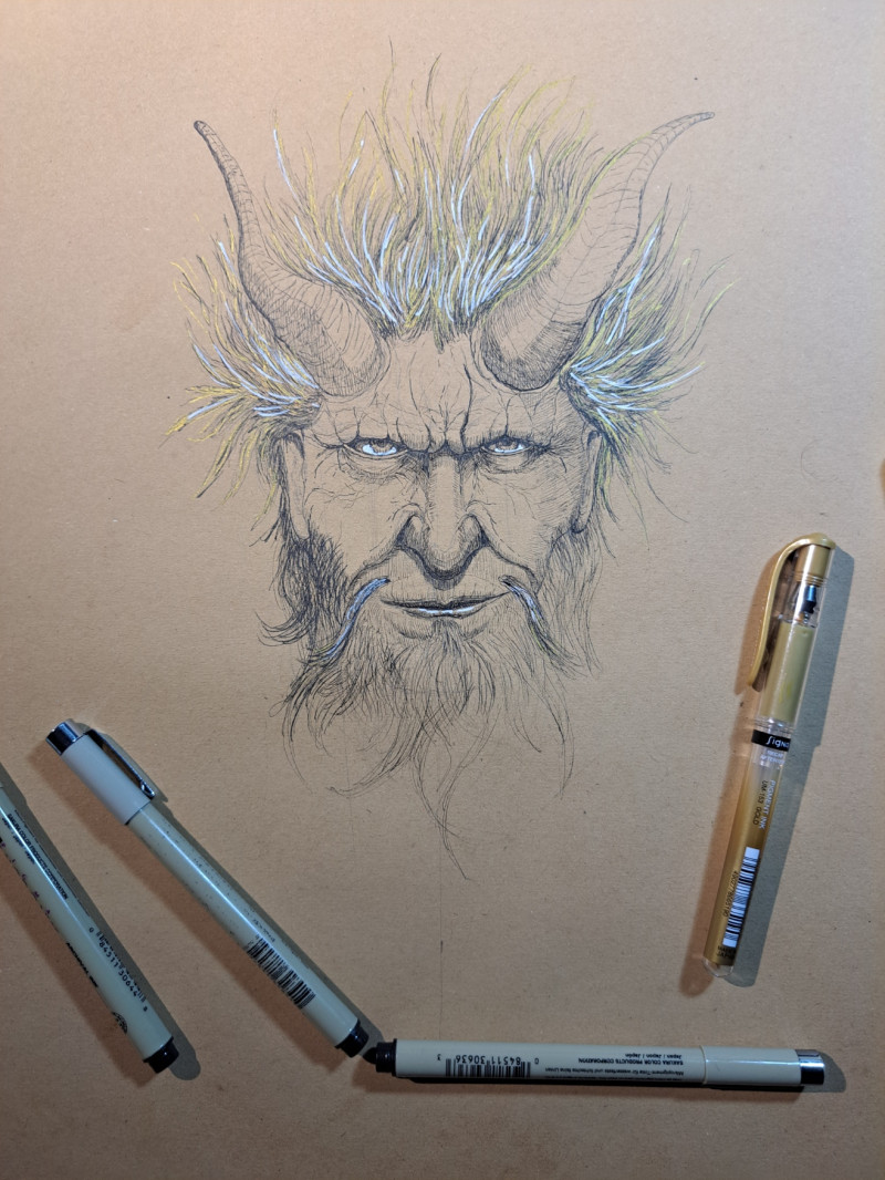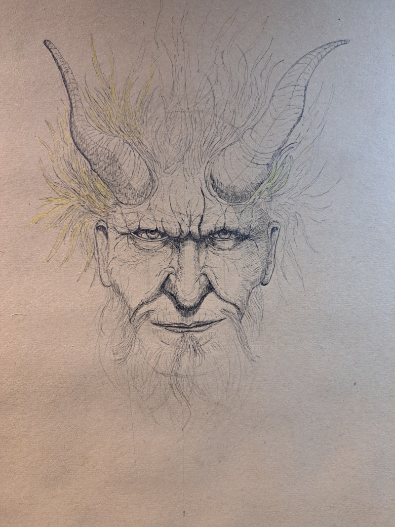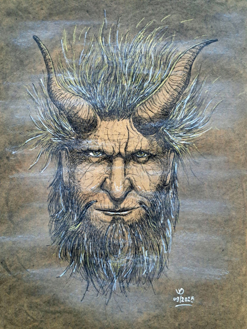 A mythical being caught between man and demon, wildness and wisdom. Its piercing gaze and untamed mane, highlighted with subtle white and golden strokes, render it both menacing and captivating. Drawn in ink and pencil on toned paper, the textures emerge raw and alive. This portrait echoes ancient legends and archetypes of power and mystery.