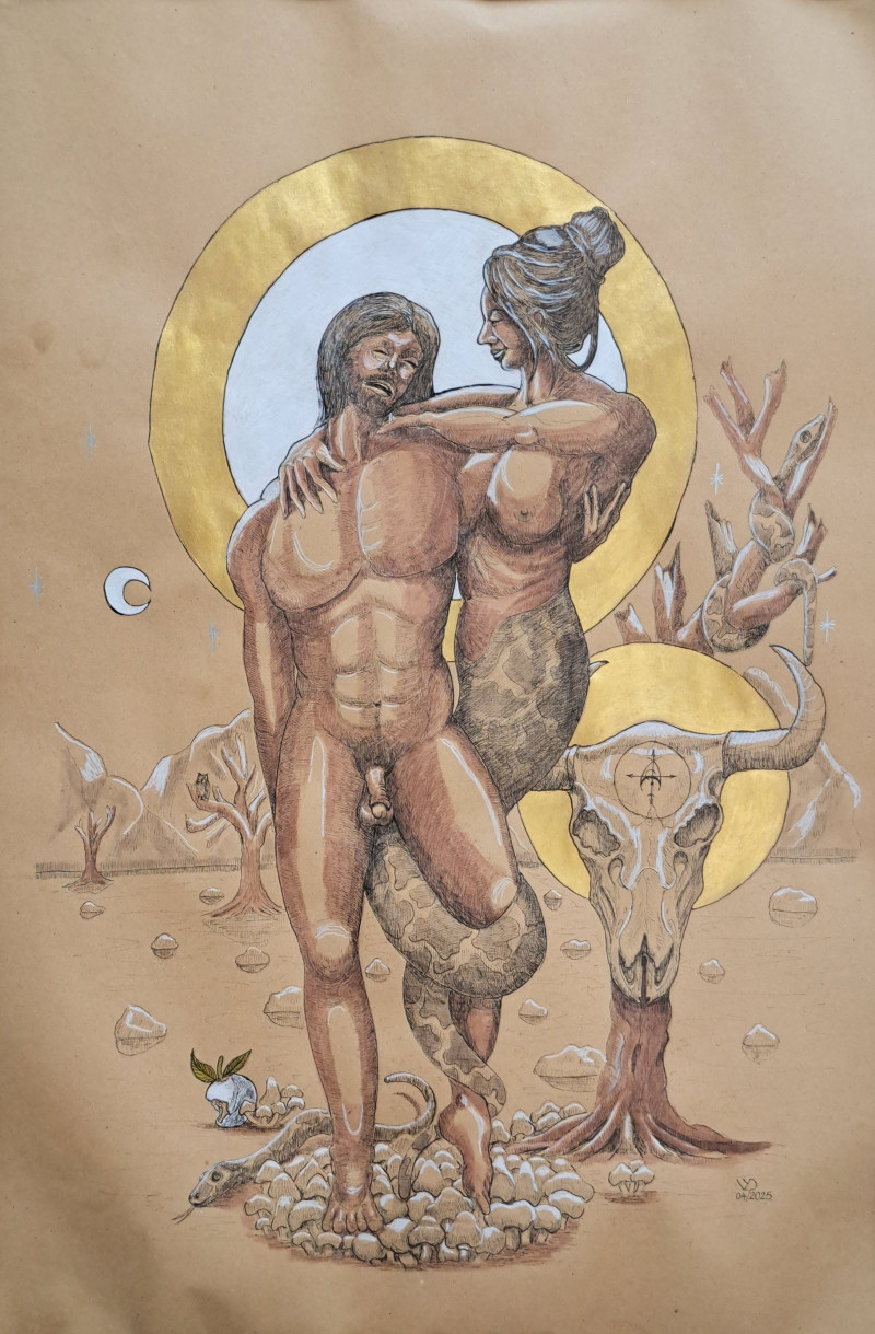 The Seduction of Adam fuses love and betrayal, as passion and ruin entwine in a dance of flesh and myth.