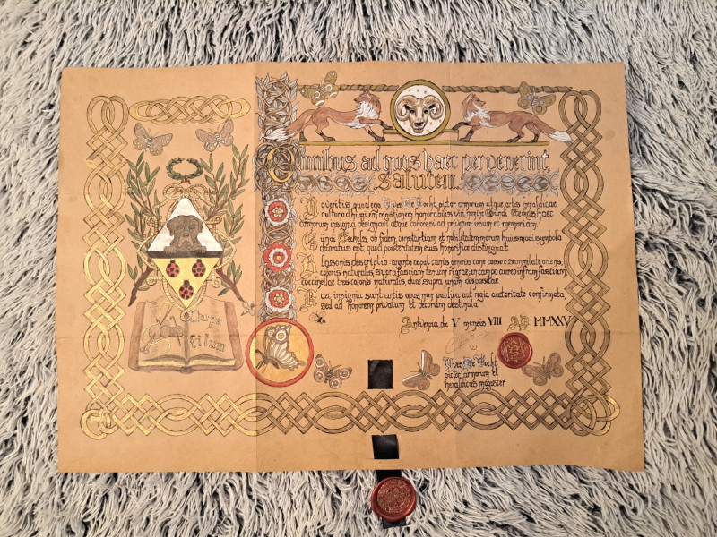 This illuminated grant of arms was created in honor of Gündi — teacher, devoted craftswoman, and passionate knitter and crocheter. At the heart of the shield rests the likeness of her beloved dog, a loyal companion immortalized as a heraldic guardian. Three ladybirds, delicately placed, symbolize her three children — the sources of her joy and legacy.